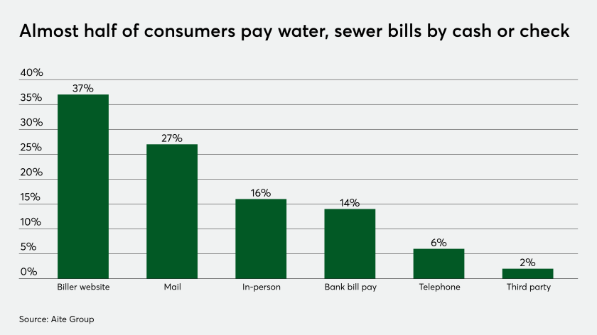 In a survey of 3,000 U.S. consumers Aite Group conducted this year for consumer banking bill site provider BillGO, Aite Group found that 16% of consumers' one-time water and sewer payments typically are made in person, and 33% of those are in cash.